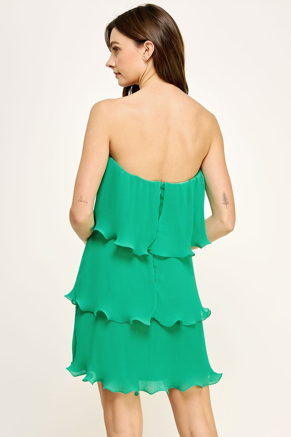 Look effortlessly stunning in our Pleated Mini Dress. It’s designed with fully pleated tiers and a lettuce hem, plus a hidden back zipper and strapless design. Crafted from light and airy chiffon fabric, it’s perfect for your special event.