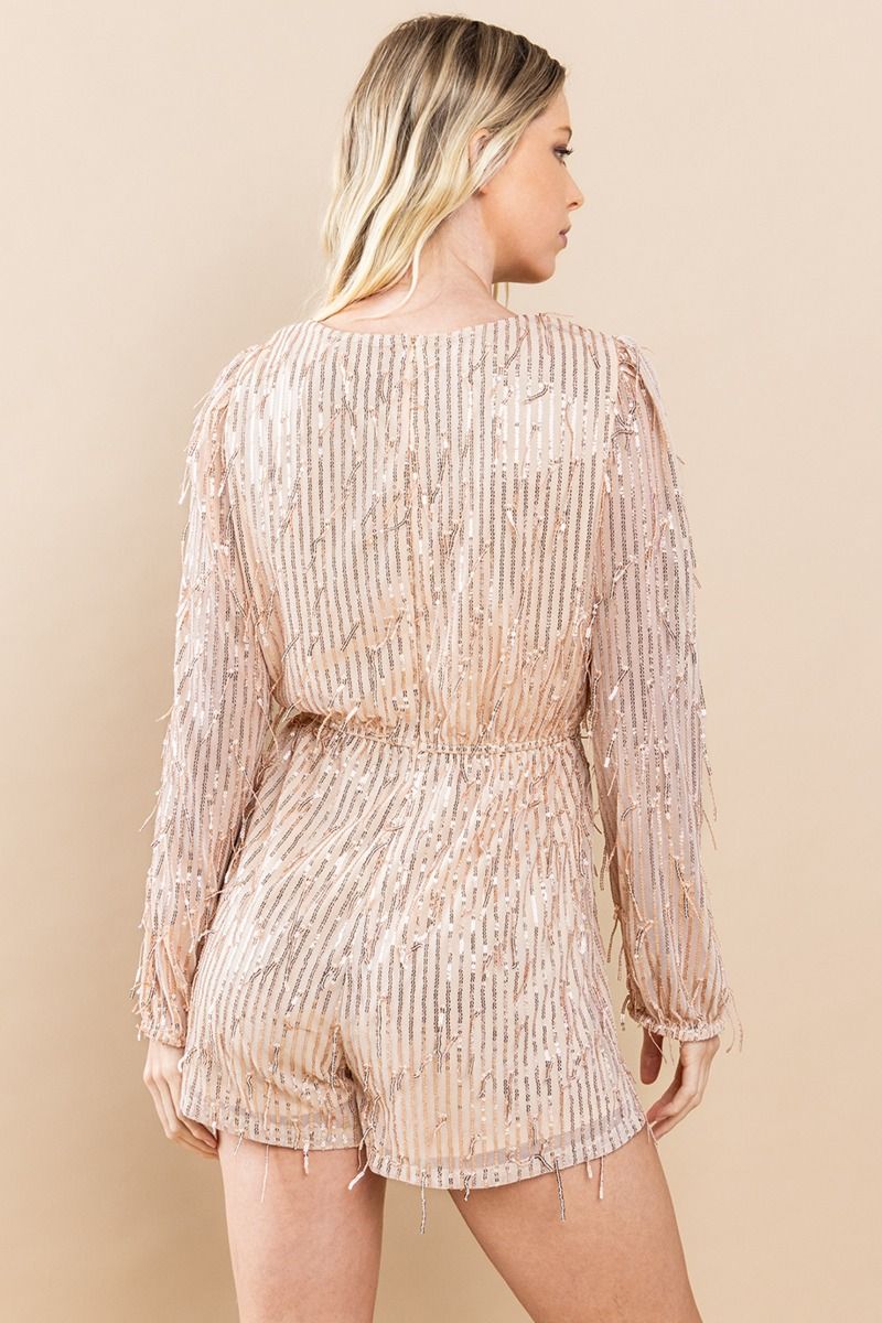 Celebrate in style with this gorgeous V-neck champagne sequin romper. It features long sleeves and a concealed back zipper, making it easy to get ready for a night out. Sparkle and shine in this perfect party piece!